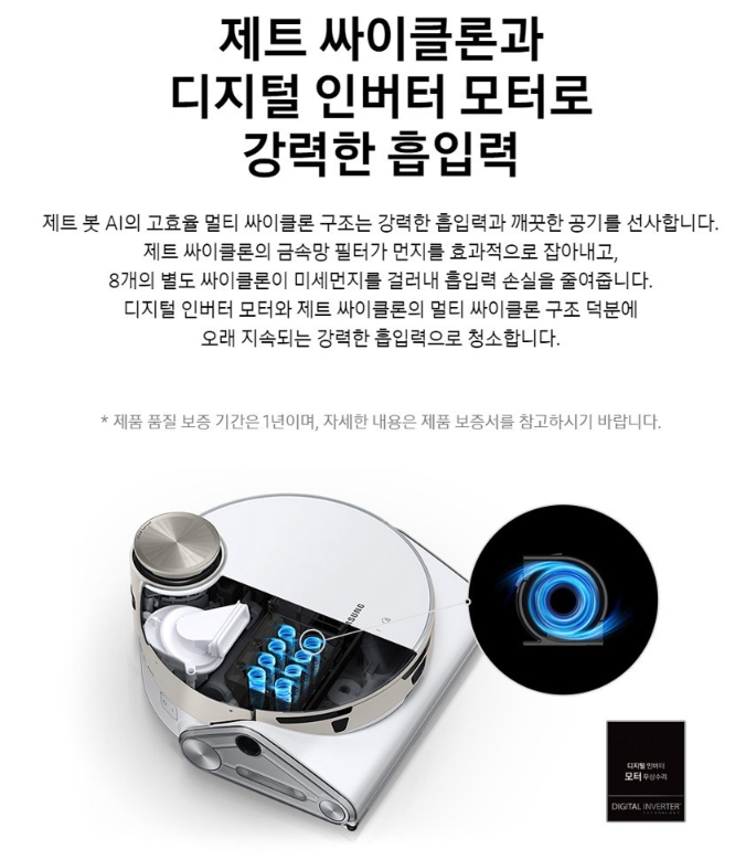 삼성의 **제트봇 AI+**는 강력한 흡입력과 AI 기반 스마트 기능으로